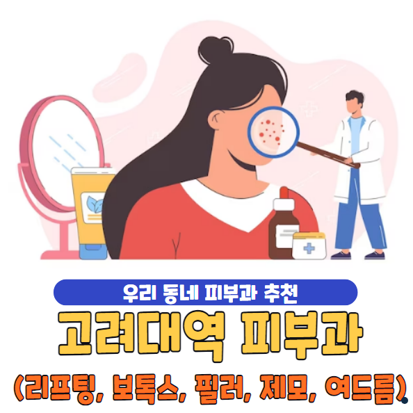 고려대역 피부과 잘하는 곳 5곳 소개 | 전문의 일요일 진료 유명한 곳 | 보톡스, 필러, 레이저제모, 리프팅, 여드름 시술 한눈에 비교