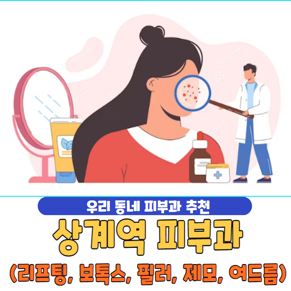 이제 실제로 상계역에서 각종 시술을 잘하는 피부과를 소개할게요. 리프팅, 보톡스, 필러, 레이저제모, 여드름 치료 등 다양한 분야의 병원들을 모아봤으니 관심 있는 분야의 피부과를 골라보세요^^